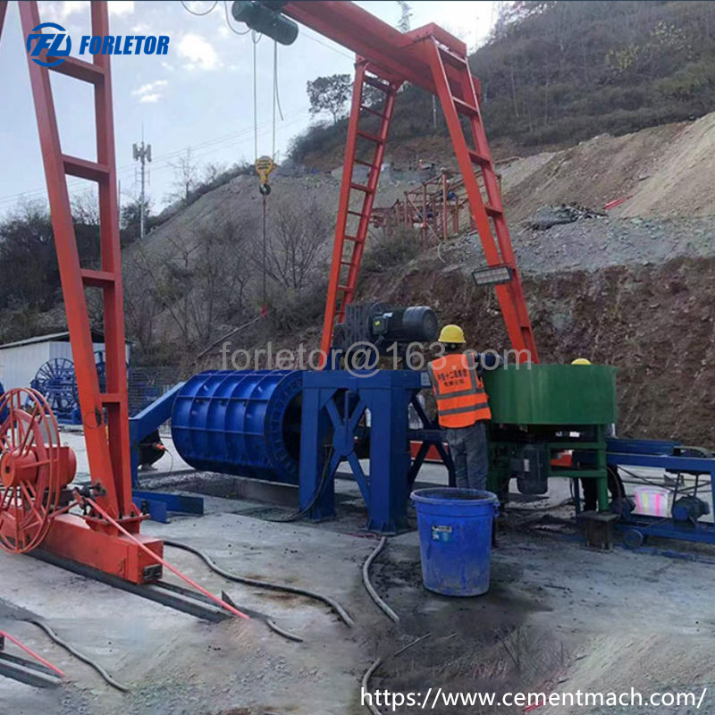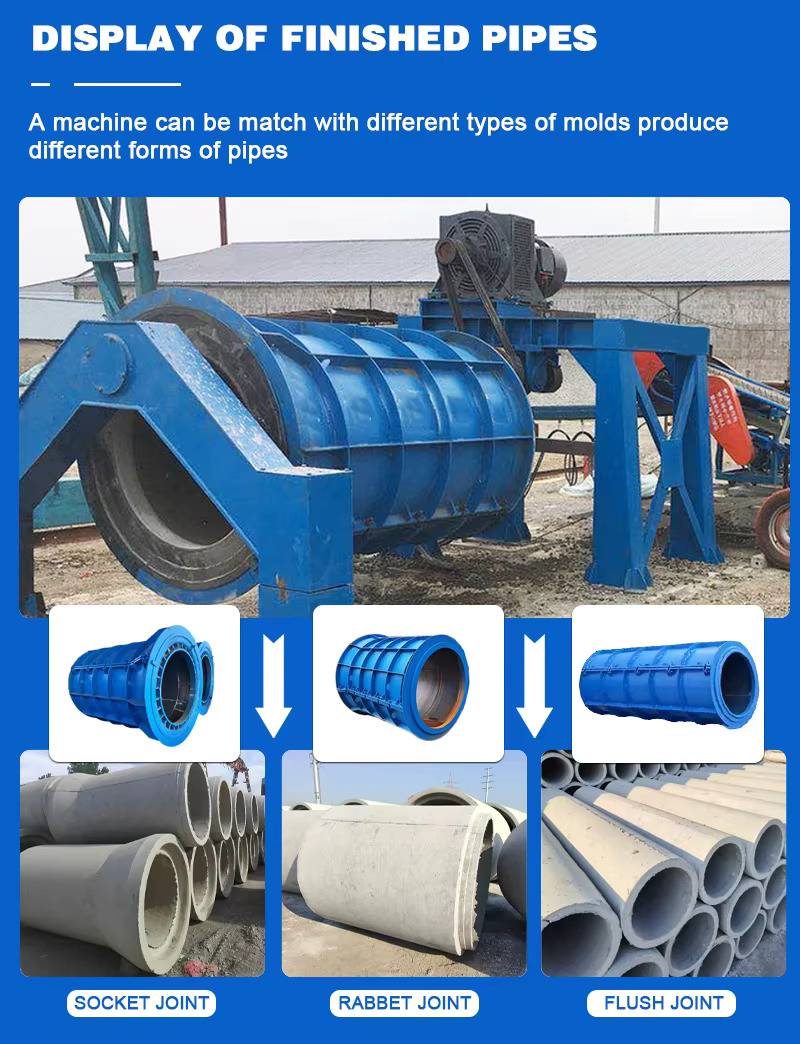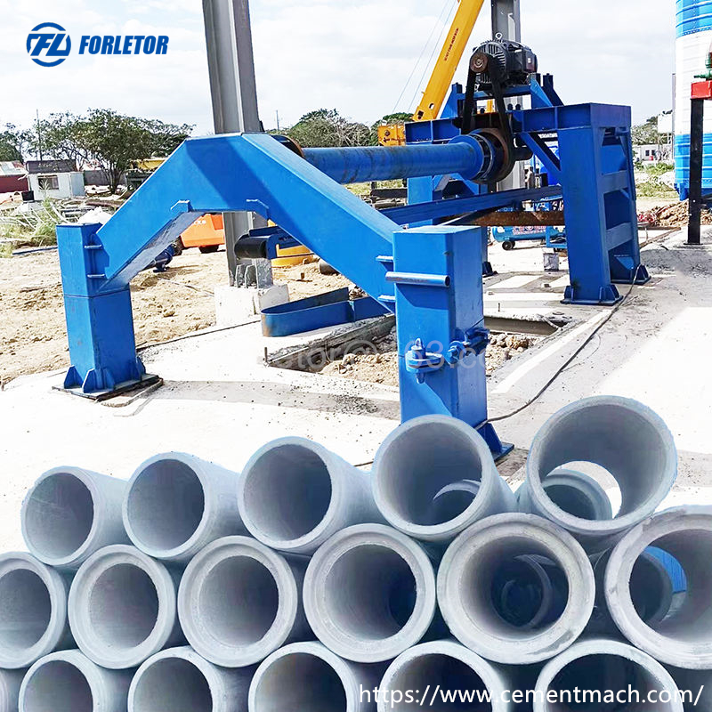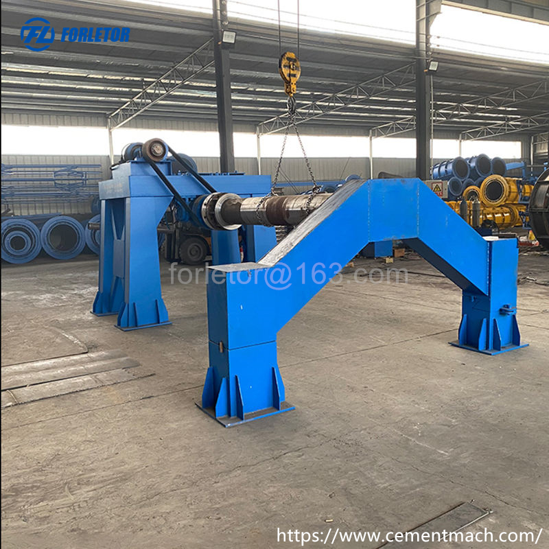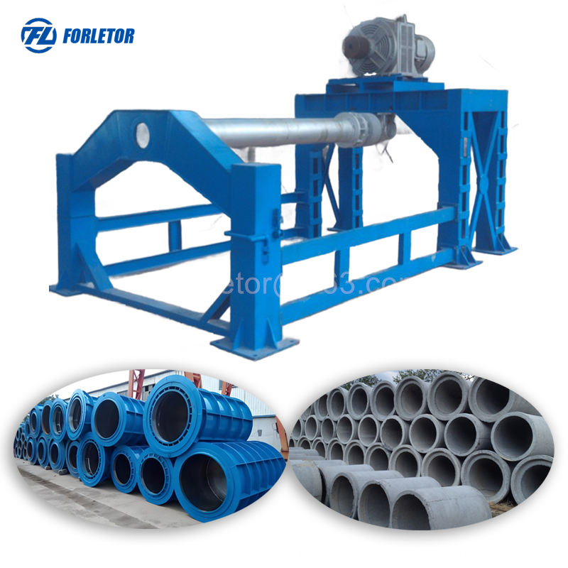 This machine uses the Roller to support the concrete pipe mould, and produce the roller force to concrete in the mould. When the roller rotate at a high speed, the concrete in the mould will spread in the inner wall of the pipe mould and form a cement pipe with the centrifugal force, and when the mould with the inner concrete pass on the roller, the concrete etween the mould and the roller will be compacted solid to form a pipe.