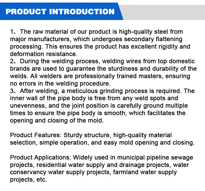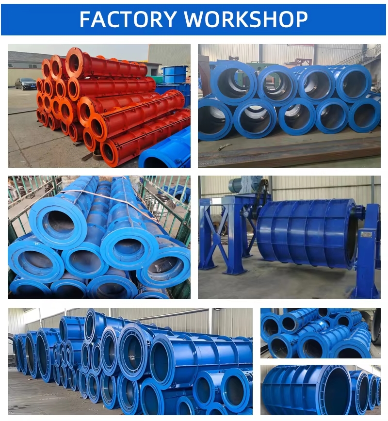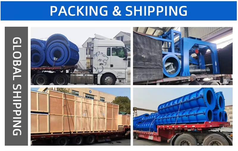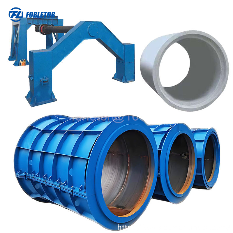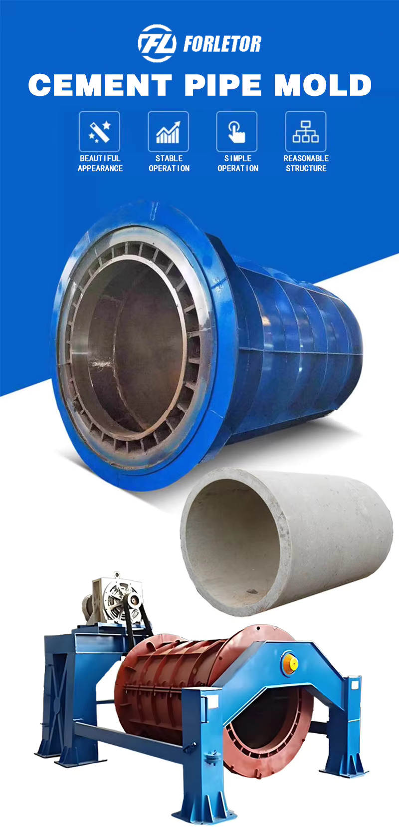 This machine uses the Roller to support the concrete pipe mould, and produce the roller force to concrete in the mould. When the roller rotate at a high speed, the concrete in the mould will spread in the inner wall of the pipe mould and form a cement pipe with the centrifugal force, and when the mould with the inner concrete pass on the roller, the concrete etween the mould and the roller will be compacted solid to form a pipe.
